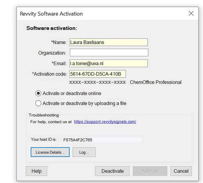 Go to the tab 'Help'and 'Licensing' in ChemDraw: