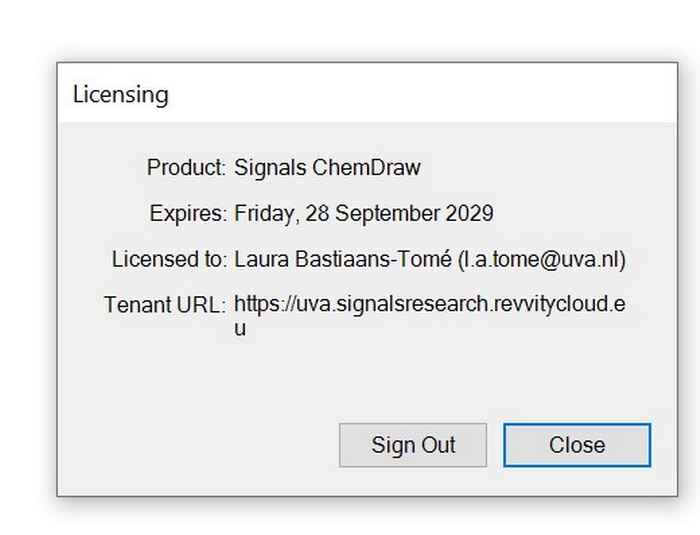 Click on 'OK'. ChemDraw will resytart itself. When you look under 'Help'and 'Licensing', you will see that you have the new license that will expire in September 2029: