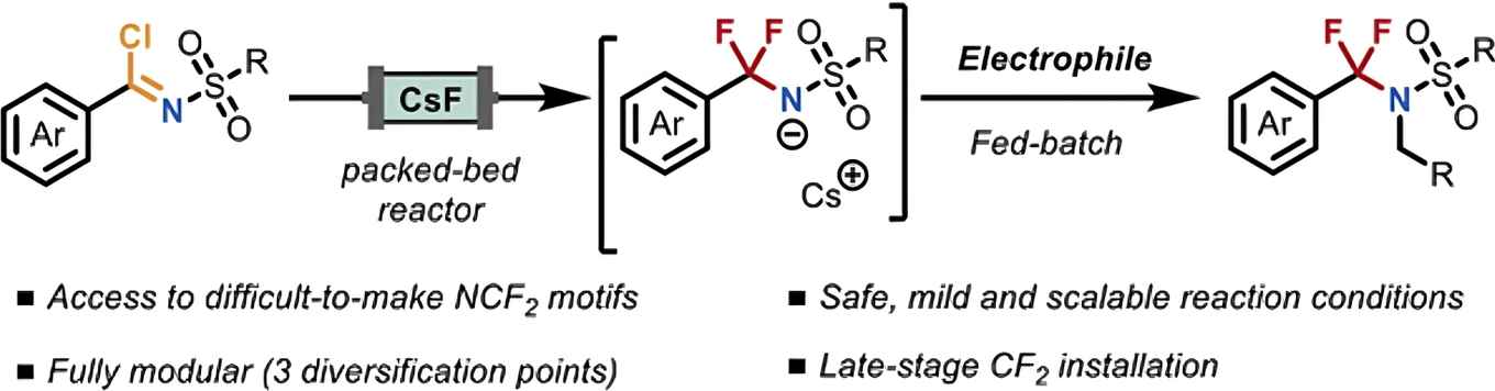 At the heart of the strategy is the on-demand generation of NCF2R anions using a packed-bed microreactor containing CsF. It features mild conditions, avoids hazardous fluorinating reagents and minimizes fluorinated waste. Leveraging three points of diversification, it allows efficient access to a broad range of NCF2R scaffolds. The method is compatible with complex drug-like scaffolds, making it a powerful tool for medicinal and fluorine chemistry.