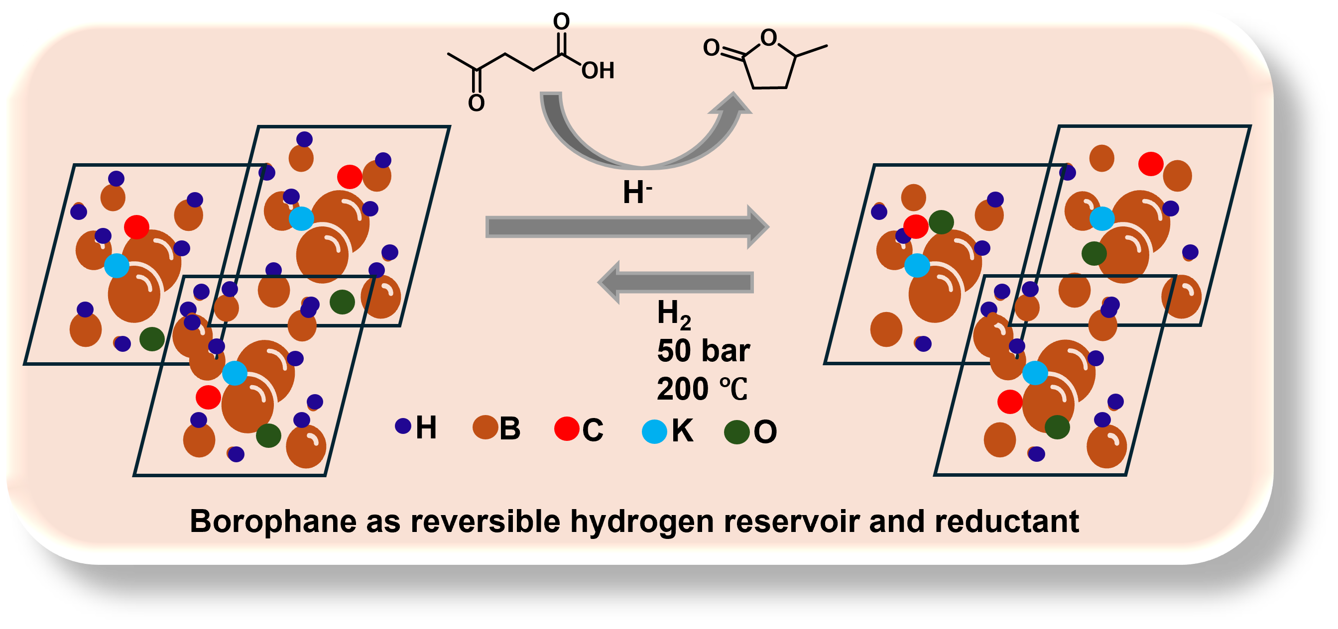 In addition to hydrogen storage, the study demonstrates the dual functionality of potassium-doped borophane as a metal-free reducing agent through selective hydrogen transfer. The BH nanosheets effectively facilitate the conversion of levulinic acid (LA), a biomass-derived platform molecule, into γ-valerolactone (GVL), which typically requires high temperatures and high hydrogen pressures or noble metal catalysts. Using borophane as a hydrogen provider, the conversion could be carried out at significantly milder conditions.